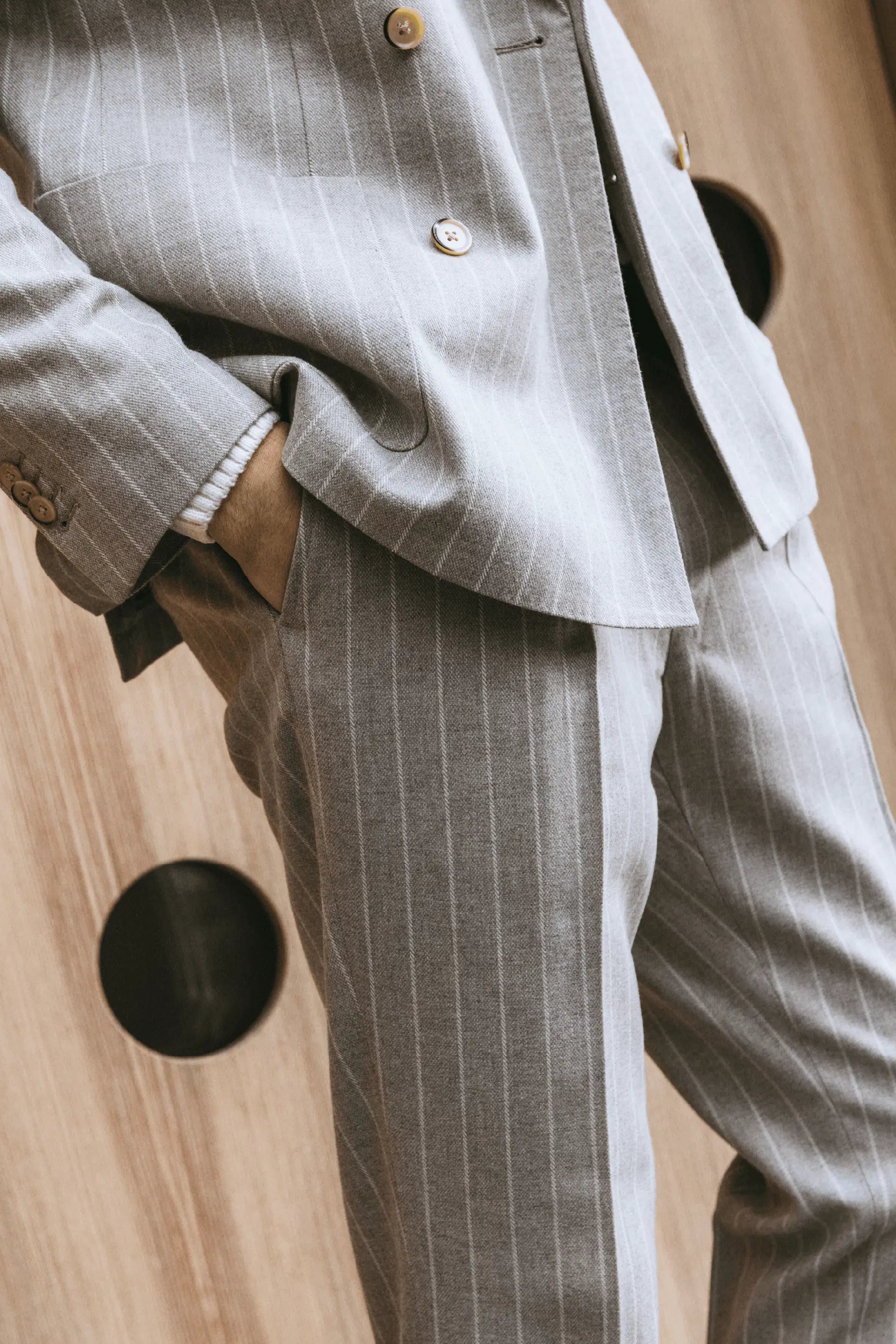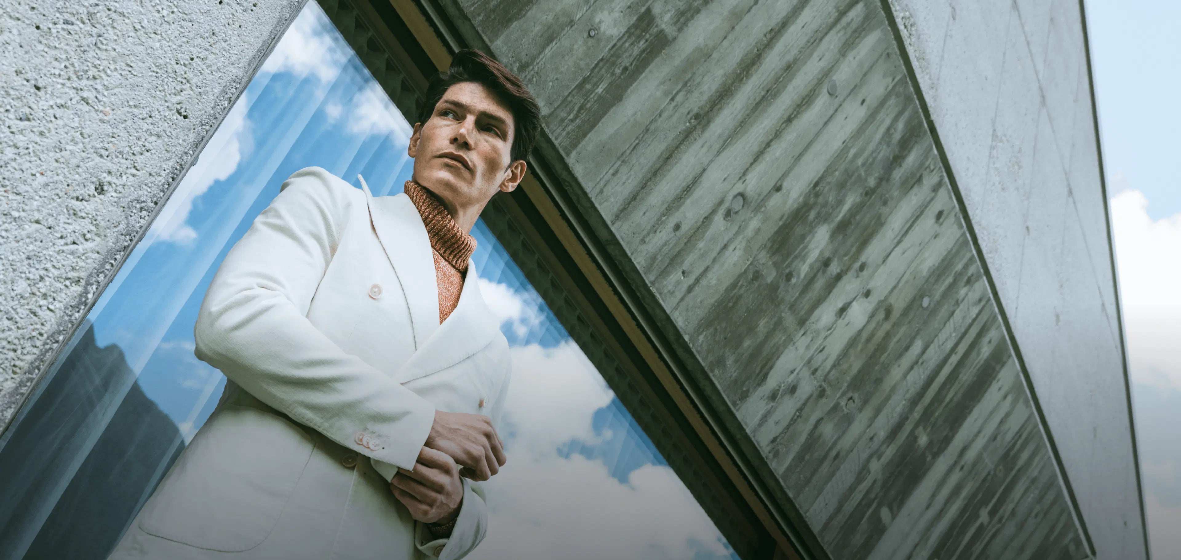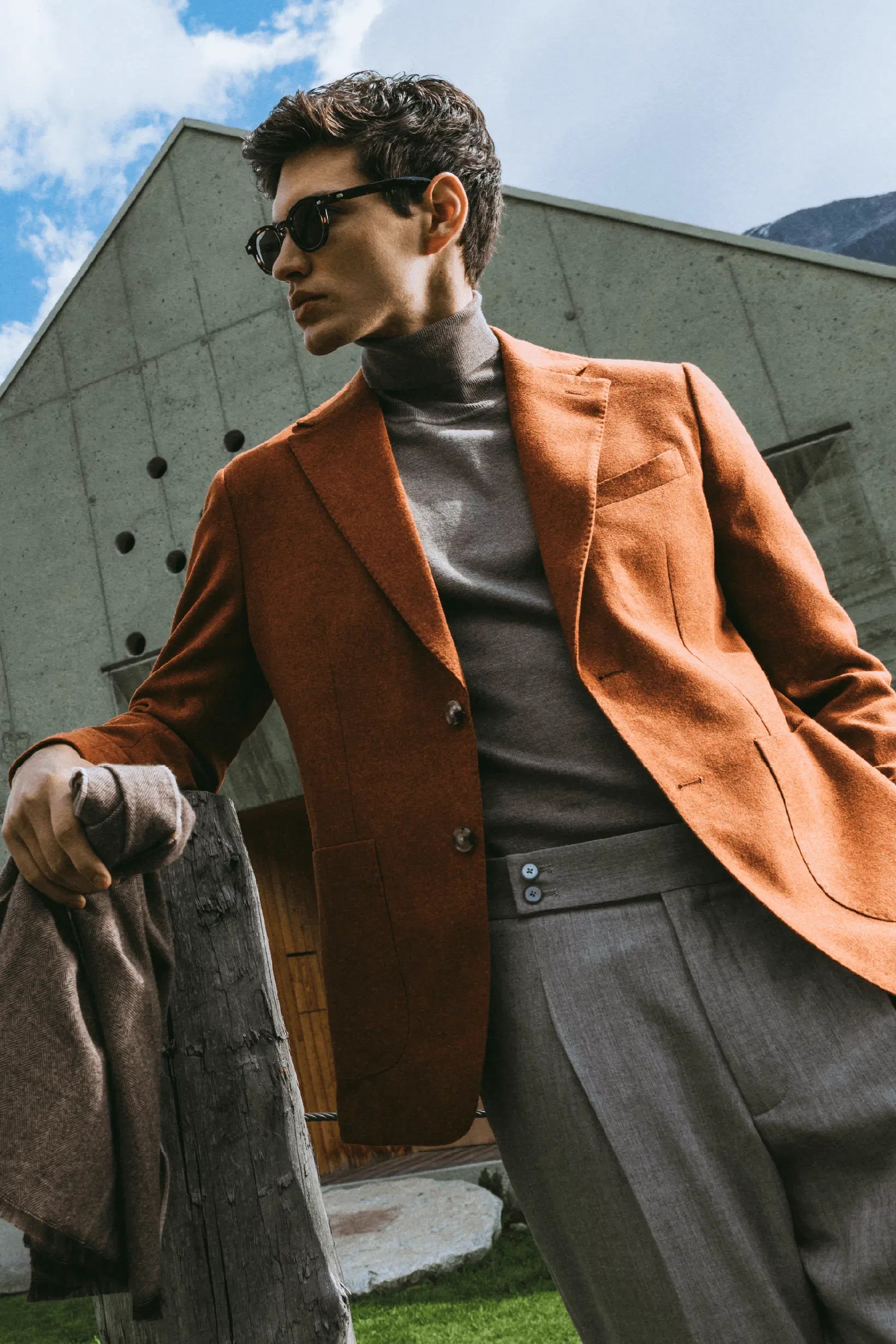 Un’ode all’autenticità, ambientata nel cuore delle Dolomiti, dove la natura si fa scenografia e ispirazione per un uomo che cerca connessioni vere, profonde. Qui, il linguaggio dell’architettura si intreccia con quello della montagna: cemento e vetro incontrano legno caldo e linee essenziali, dando forma a uno spazio sospeso tra rigore formale e calore umano. La luce naturale attraversa ampie vetrate, accarezza gli abiti, illumina i volti, svela emozioni. Non solo scatti, ma istanti vissuti: due figure si muovono, abitano, respirano questi luoghi. Non semplici modelli, ma presenze che raccontano, con gesti, sguardi e silenzi, un dialogo costante tra radici e contemporaneità. Gli abiti indossati sono formali, ma rivisitati in chiave moderna: volumi più morbidi dialogano con lo stile sartoriale, ridefinendo l’eleganza maschile in una visione più libera e consapevole. Ogni capo è pensato per un uomo che vive il presente con stile, senza rinunciare alla propria identità.